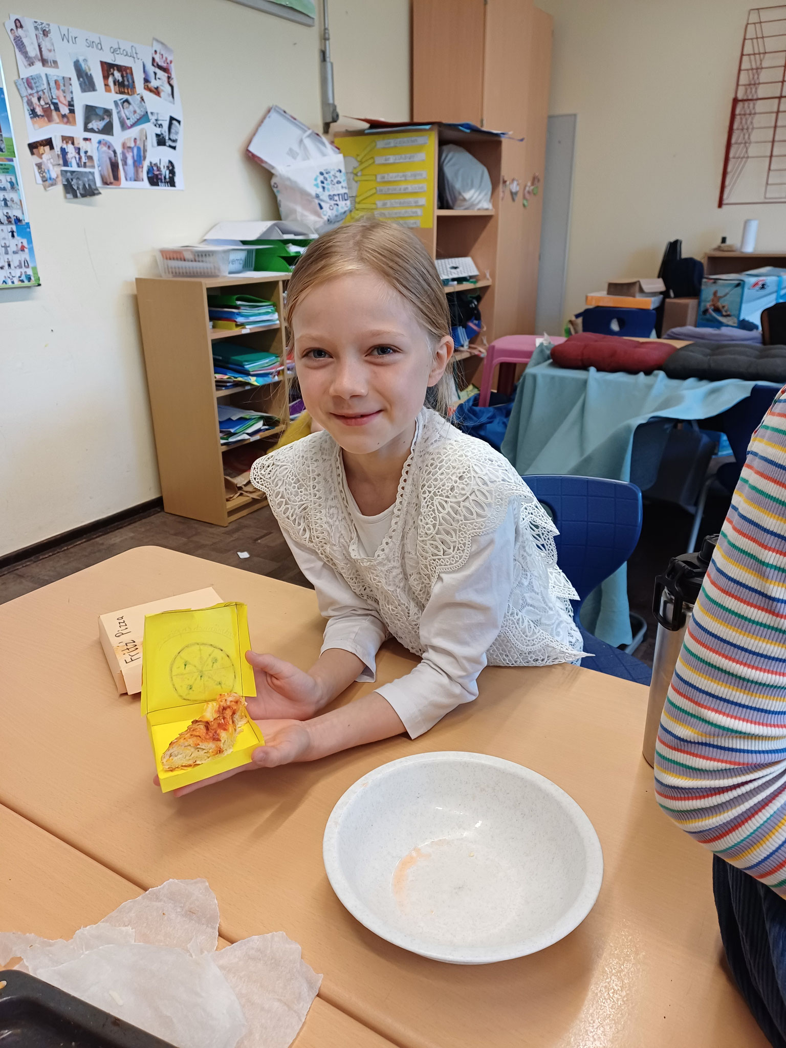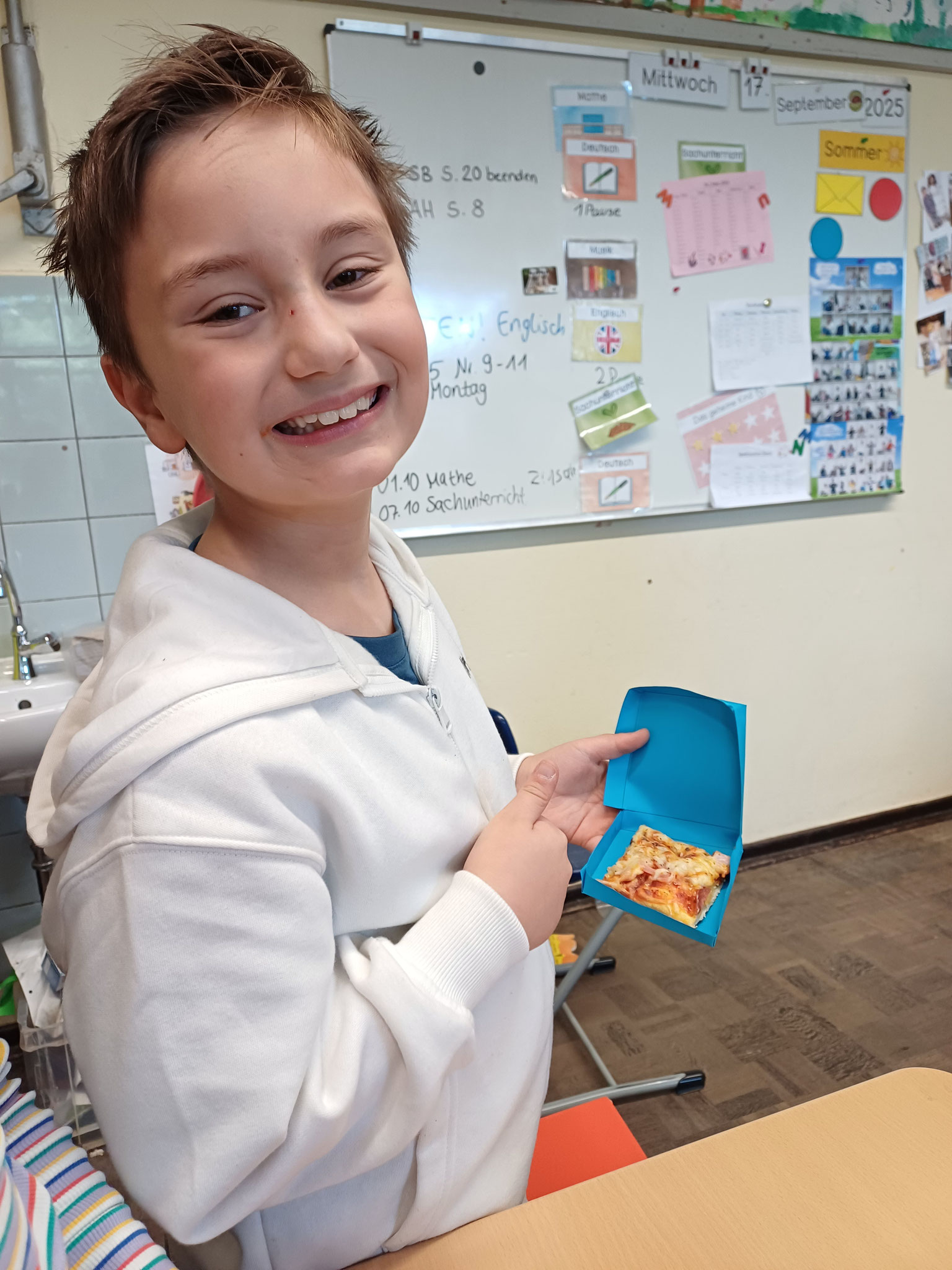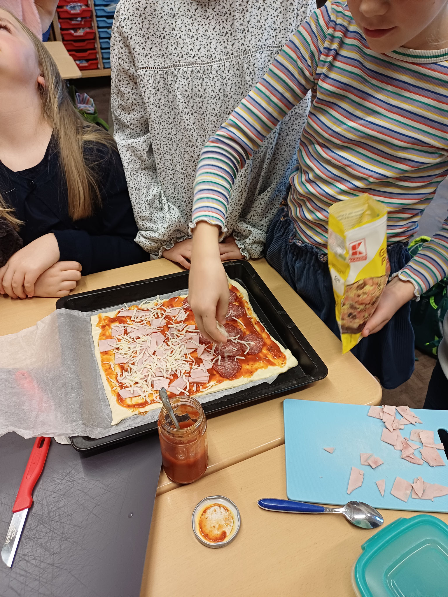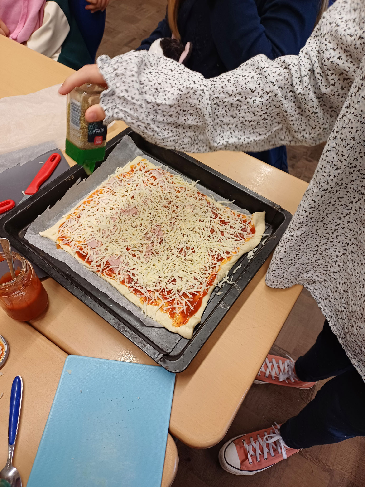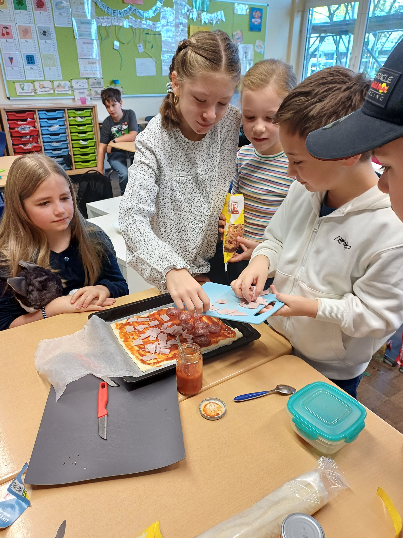 Am heutigen Dienstag hat die Klasse 4a ein ganz besonderes Projekt umgesetzt: Gemeinsam wurde Pizza gebacken! Mit viel Freude rollten die Kinder den Teig aus, belegten ihn mit frischen Zutaten und gestalteten ihre eigenen Pizzen.
