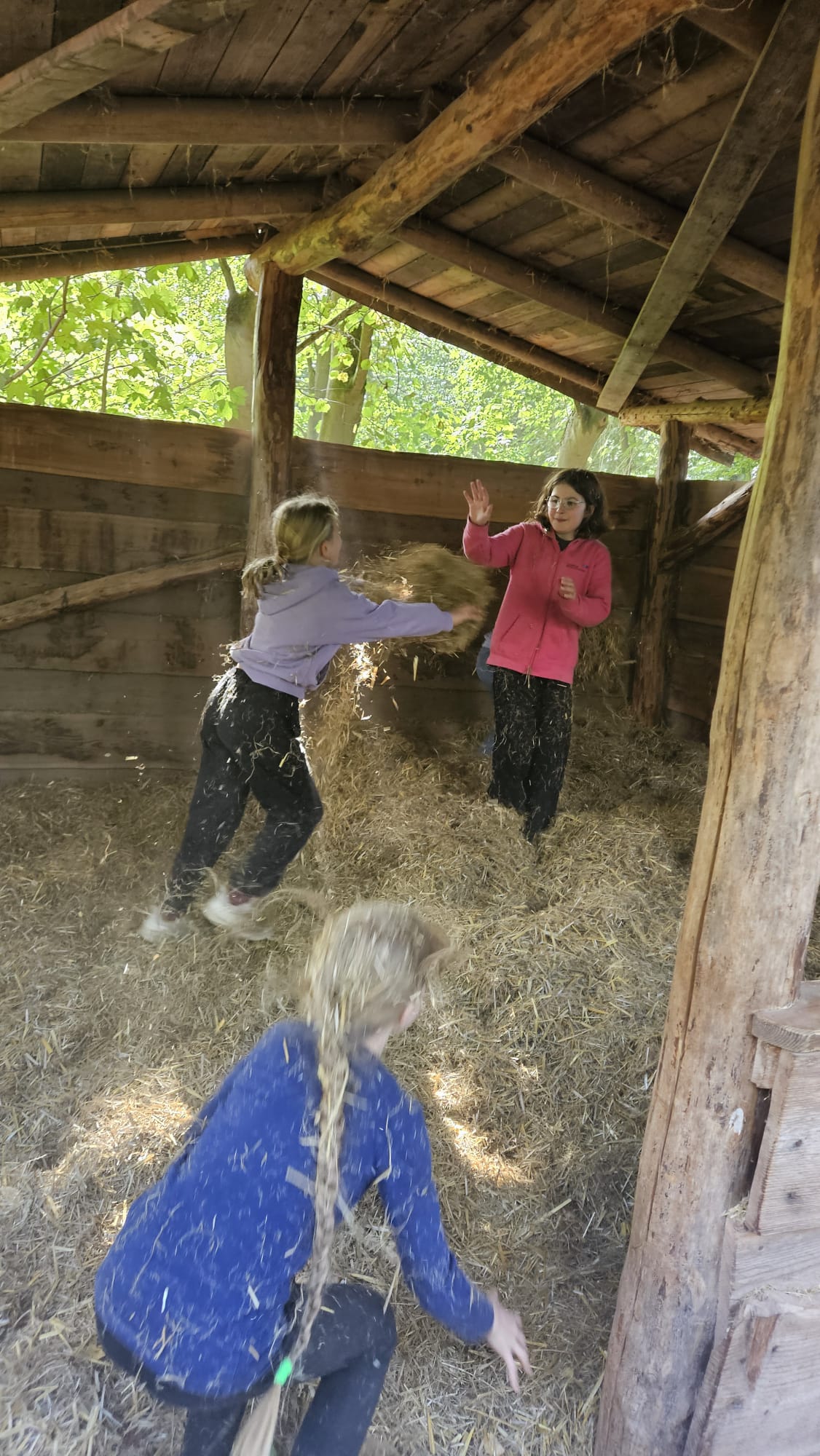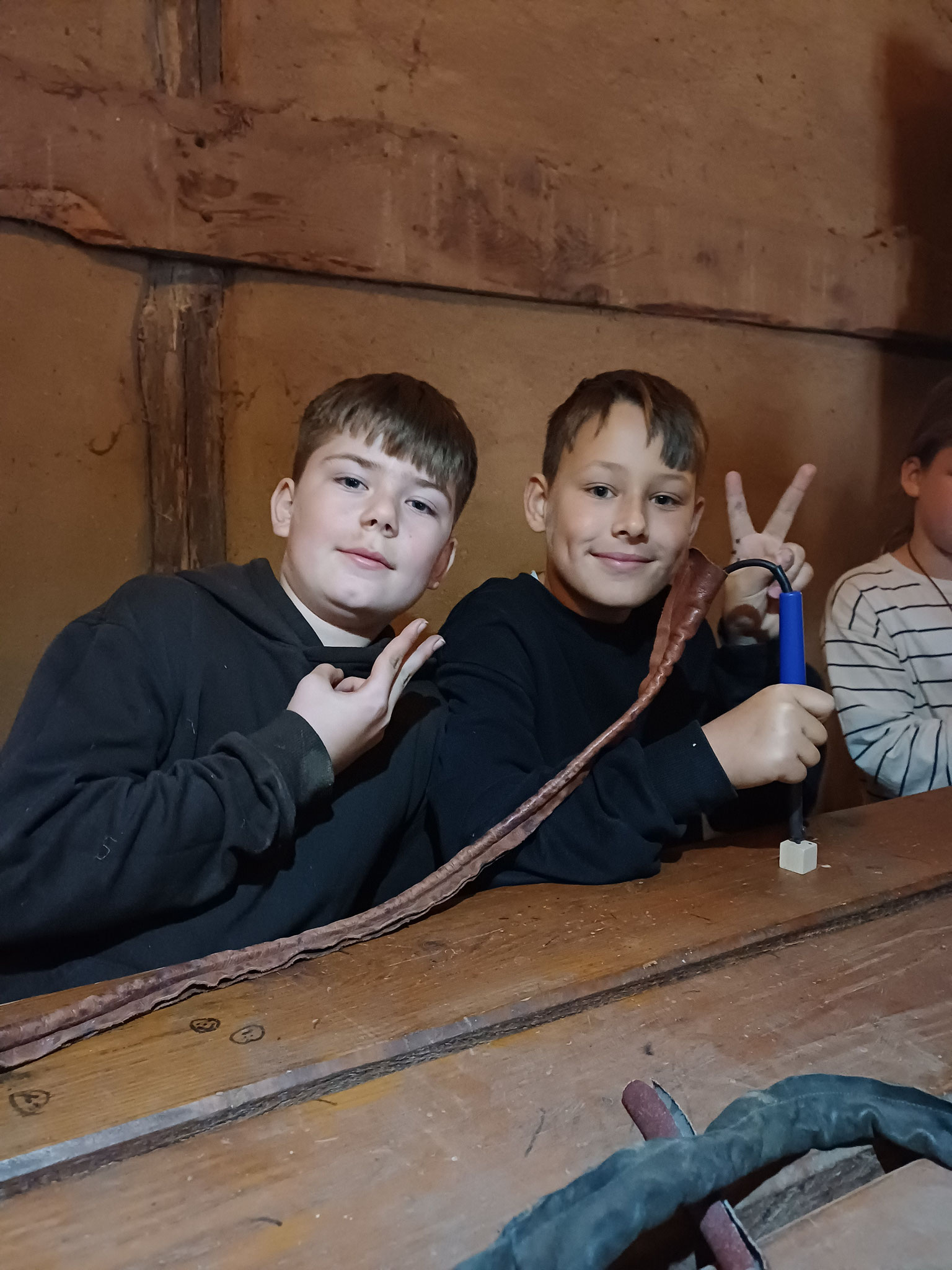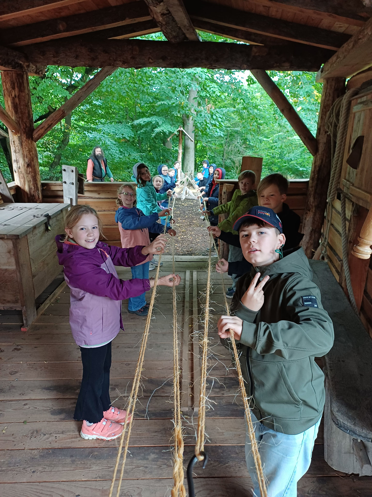 Am Mittwochmorgen starteten die Klassen gemeinsam mit Frau Radow und Frau Höger mit dem Bus – die Fahrt dauerte etwa eineinhalb Stunden. Nach der Ankunft gab es zunächst eine Führung durch das Mittelalterdorf und anschließend konnten die Kinder ihre Zimmer beziehen. Nach dem Mittagessen standen die ersten Aktivitäten auf dem Programm: Wir bastelten Lederbeutel mit einem kleinen Spiel darin, brannten das Logo des Mittelalterdorfs in Holzplatten ein und schliffen diese sorgfältig ab. Natürlich durfte auch das Spielen im Stroh nicht fehlen – ein echtes Highlight für viele.