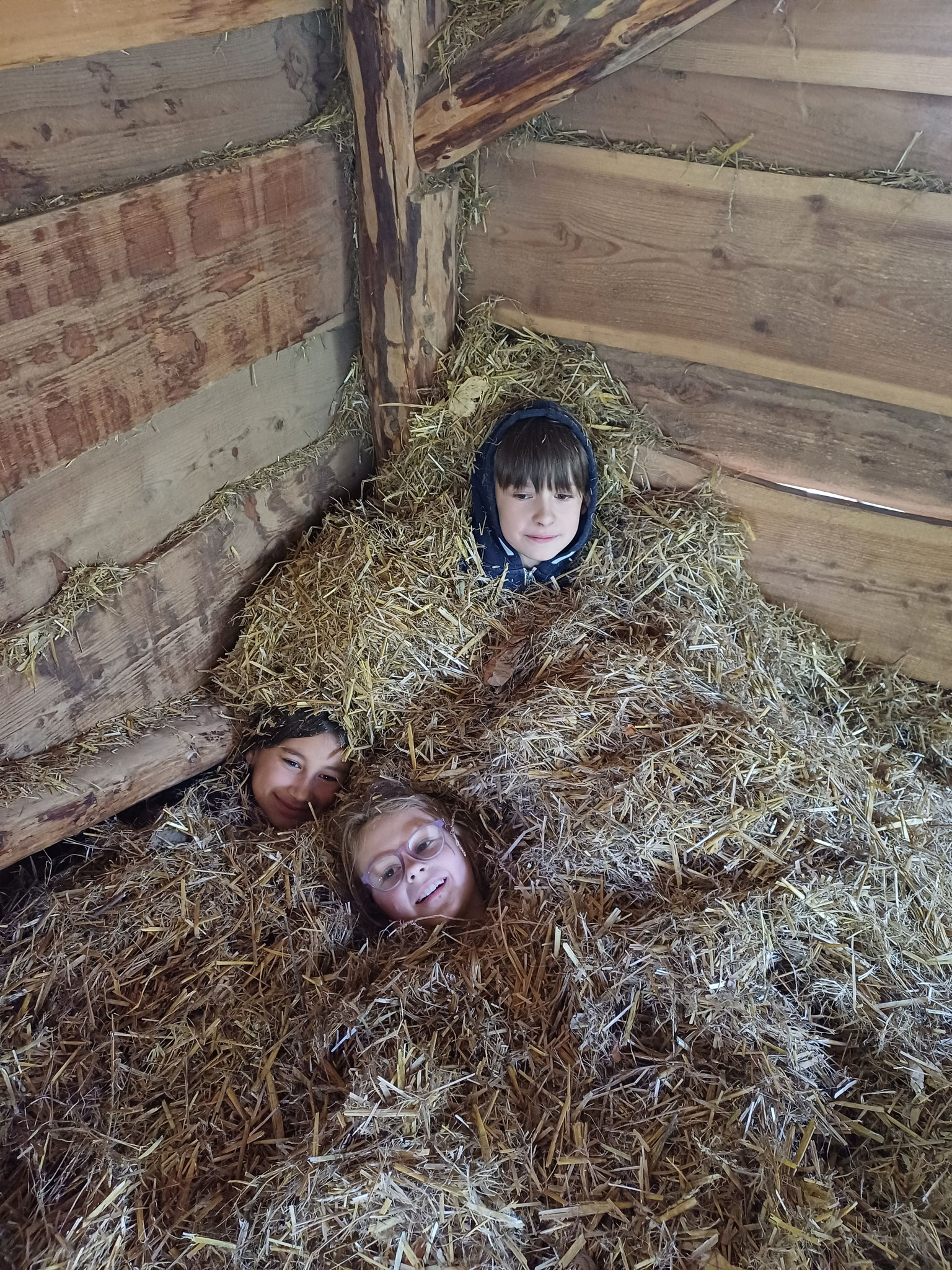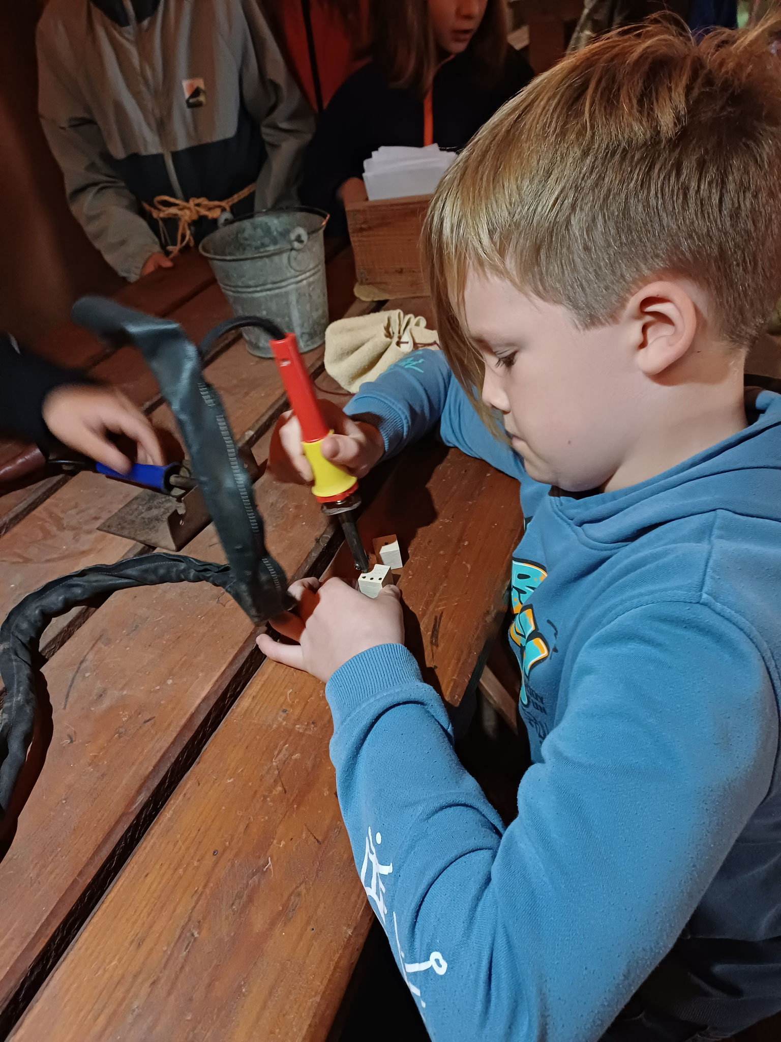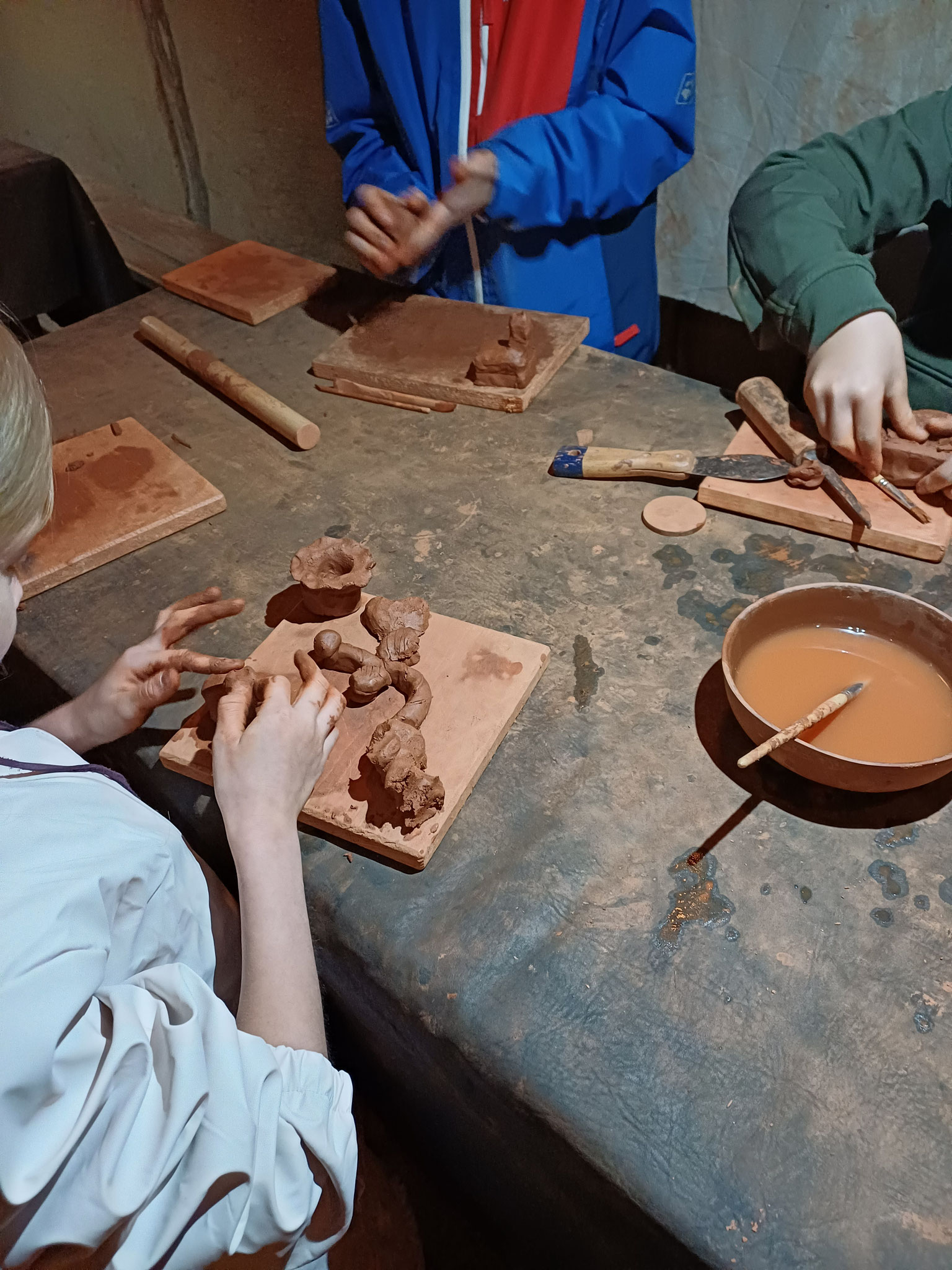 Am Mittwochmorgen starteten die Klassen gemeinsam mit Frau Radow und Frau Höger mit dem Bus – die Fahrt dauerte etwa eineinhalb Stunden. Nach der Ankunft gab es zunächst eine Führung durch das Mittelalterdorf und anschließend konnten die Kinder ihre Zimmer beziehen. Nach dem Mittagessen standen die ersten Aktivitäten auf dem Programm: Wir bastelten Lederbeutel mit einem kleinen Spiel darin, brannten das Logo des Mittelalterdorfs in Holzplatten ein und schliffen diese sorgfältig ab. Natürlich durfte auch das Spielen im Stroh nicht fehlen – ein echtes Highlight für viele.