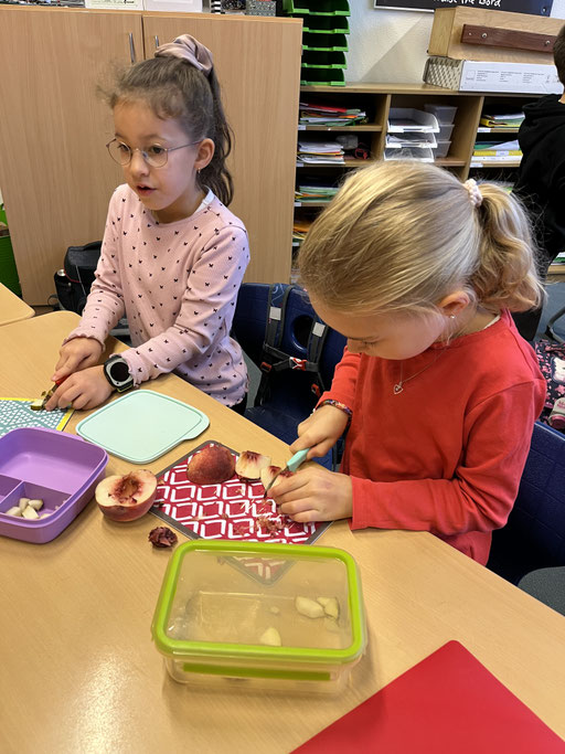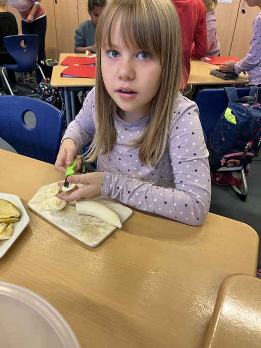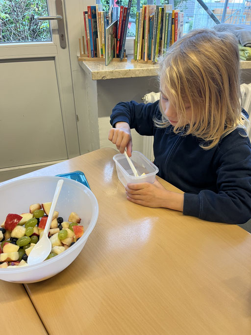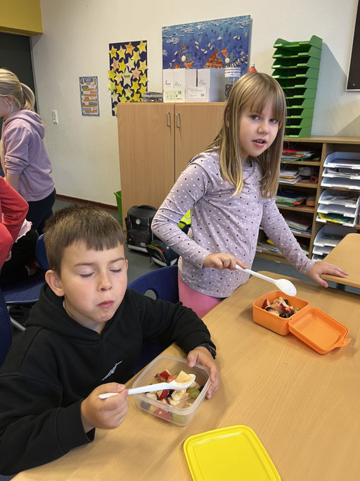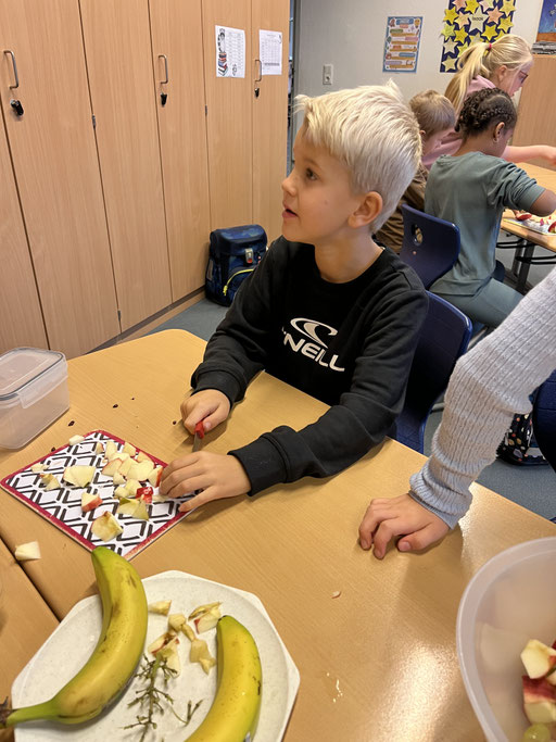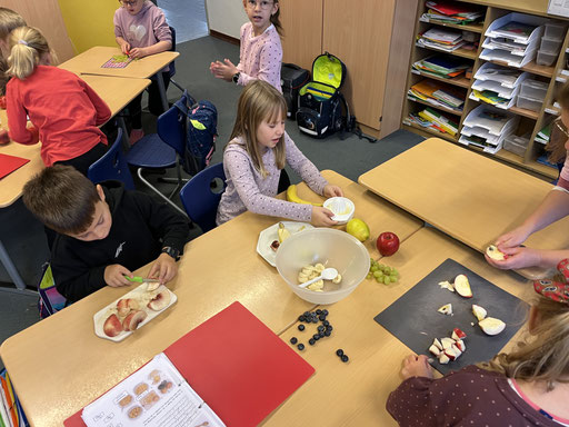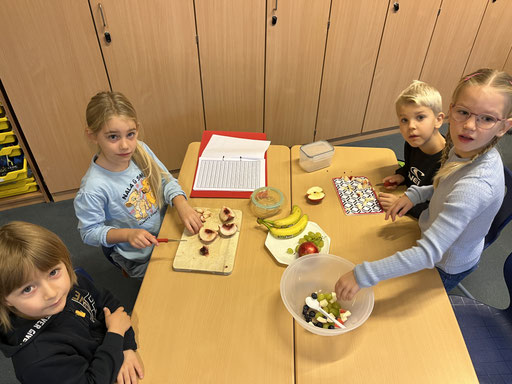 Am letzten Schultag vor den Ferien probierte die Klasse 2a aktiv aus, was sie zuvor im Deutschunterricht geübt hatten. In den vergangenen Deutschstunden ging es darum Rezepte zu schreiben. Die Kinder der Klasse 2a lernten, dass es wichtig ist die richtige Reihenfolge einzuhalten, alles möglichst genau zu beschreiben und verschiedene Satzanfänge zu benutzen, damit das Rezept interessanter zu lesen ist. Das erste Rezept, was alle Kinder zu einer Bildfolge selbst geschrieben haben, probierten wir dann am Freitag in Gruppenarbeit aus. Das Ergebnis - ein leckerer Obstsalat - konnte sich sehen lassen.