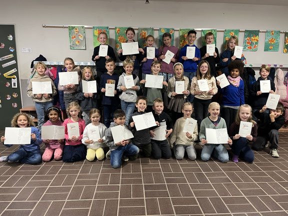 Wie es aber im Wettbewerb nunmal ist gab es einige Kinder, die besonders gute Leistungen erbracht hatten. Deshalb wurden die stolzen Gewinner der Ehrenurkunden im Morgenforum vor unserer Schulgemeinschaft geehrt. Alle anderen Kinder gingen aber natürlich nicht leer aus, denn sie erhielten ihre Urkunden von ihren Klassenlehrerinnen.